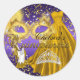 Sticker Quinceañera Gold & violet. 15e anniversaire. Joli masque en diamant étincelant & tiara avec robe or & talons de parties scintillant. Remarque : Toutes les images plates !