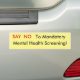 Cet autocollant de pare-chocs amènera les gens à se demander pourquoi je devrais dire non au dépistage obligatoire de la santé mentale. Une raison est que toute loi adoptée à cet égard signifierait la fin des libertés...liberté d'expression et liberté de pensée. Affichez cet autocollant de pare-chocs avant que le problème ne devienne terrible.