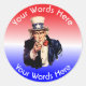 Cet autocollant patriotique est décoré avec l'Oncle Sam qui peut être customisé avec un choix de mots ci-dessus et ci-dessous qui vous permettent de le personnaliser avec le nom d'une personne, d'un lieu, d'un poste, etc.