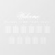 Un simple tableau blanc transparent avec 11 tables, recommandé pour un mariage, mais utilisable en d'autres occasions aussi. Il s'agit d'un cling de fenêtre, à mettre sur une fenêtre ou une autre surface transparente en verre ou acrylique. Tout le texte est blanc. Le mot Welcome est écrit dans un élégant script calligraphique, le reste en casquette. Les tables sont sur 2 rangées. Au-dessus d'eux et sous le mot Bienvenue, il y a le message "S'il vous plaît trouvez votre siège!".