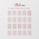Un simple tableau transparent avec 20 tables, recommandé pour un mariage bordeaux, mais utilisable en d'autres occasions. Il s'agit d'un cling de fenêtre, à mettre sur une fenêtre ou une autre surface transparente en verre ou acrylique. Tout le texte est rouge bordeaux. Le mot Welcome est écrit dans un élégant script calligraphique, le reste en casquette. Les 20 tables sont réparties sur 4 rangées x 5 colonnes. Il est orienté portrait. Au-dessus d'eux et sous le mot Bienvenue, il y a le message "S'il vous plaît trouvez votre siège!".