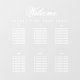 Un simple tableau de sièges transparent avec du texte blanc sur un arrière - plan transparent, avec 6 tables sur 2 rangées et 3 colonnes, recommandé pour un mariage, mais utilisable en d'autres occasions aussi. Il s'agit d'un cling de fenêtre, à mettre sur une fenêtre ou une autre surface transparente en verre ou acrylique. Tout le texte est blanc. Le mot Welcome est écrit dans un élégant script calligraphique, le reste en casquette. Au-dessus d'eux et sous le mot Bienvenue, il y a le message "S'il vous plaît trouvez votre siège!".