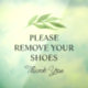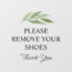 Veuillez rappeler à vos invités de retirer leurs chaussures avec cette vignette de fermeture de fenêtre personnalisée. Cette élégante décoration de fenêtre comporte une branche de feuille de verdure aquarelle et une police de script de calligraphie moderne.