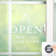 Fenêtre d'heures d'ouverture pour un salon de coiffure ou une couturière avec une paire de ciseaux blancs sur OUVERT écrit en lettres élégantes, et bienvenue dans un script tourbillonnant. Ajoutez vos heures d'ouverture. Un autocollant de fenêtre d'heures d'ouverture minimaliste et propre pour un salon de coiffure, un salon de barbier ou similaire.