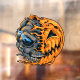 Effrayant jack-o-lanterne qui fond un crâne éffrayant aux yeux bleus.