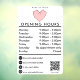 Un autocollant de fenêtre d'heures d'ouverture blanc et un décor de fenêtre avec un logo de cœur en épingles, QR Code, vos icônes de médias sociaux personnalisés et coordonnées. Un autocollant de fenêtre d'heures de magasin personnalisé parfait pour les vitrines de magasins et les panneaux de porte d'entrée. Parfait pour un propriétaire de magasin qui souhaite informer ses clients de ses heures d'ouverture.