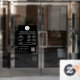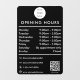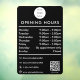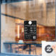 Un autocollant de fenêtre d'heures d'ouverture noir et un adhésif de fenêtre comportant le logo de l'entreprise, le code QR, vos icônes de médias sociaux personnalisés et les coordonnées. Un adhésif de fenêtre d'heures de magasin personnalisé parfait pour les vitrines et les enseignes de porte d'entrée. Parfait pour un propriétaire de magasin qui souhaite informer ses clients de ses heures d'ouverture.