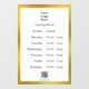 Ce panneau d'entreprise comporte un modèle que vous pouvez modifier pour afficher vos heures d'ouverture. Une image d'affichage, que vous pouvez remplacer par le logo de votre entreprise, est en haut. Un code QR est en bas. (N'oubliez pas d'entrer votre site web pour que le code QR fonctionne correctement.) Tout le texte peut être modifié ou supprimé. Le panneau a une bordure en or (pas de feuille) en faux élégant.