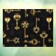 Seamless pattern of antique, gold and silhouette keys on black background.