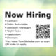 Ceci est un modèle de panneau « Nous embauchons maintenant ». Le titre indique « Nous embauchons maintenant ». Il y a 6 titres de poste énumérés que vous pouvez modifier en fonction des postes disponibles dans votre entreprise. Du texte supplémentaire est en bas que vous pouvez modifier. Tout le texte est noir et peut être modifié ou supprimé. Un code QR est sur le panneau. Vous devez entrer l'URL de votre site Web pour que le code QR fonctionne correctement.