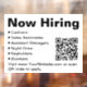 Ceci est un modèle de panneau « Nous embauchons maintenant ». Le titre indique « Nous embauchons ». Il y a 6 titres de poste énumérés que vous pouvez modifier en fonction des postes disponibles dans votre entreprise. Du texte supplémentaire est en bas que vous pouvez modifier. Tout le texte est noir et peut être modifié ou supprimé. Un code QR est sur le panneau. Vous devez entrer l'URL de votre site Web pour que le code QR fonctionne correctement.
