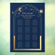 Mystical Chic Blue Gold Sun Moon Stars Astronomie Celestial Cosmic Galaxy Espace Mariage Graphique de siège Fenêtre Cling dispose d'un soleil doré, lune et étoiles cadre sur un arrière - plan bleu marine foncé. À l'intérieur du cadre est le texte "Welcome" dans l'élégant script de calligraphie dorée et vos informations personnalisées sur le plan des sièges de réception de mariage. Personnalisez en modifiant le texte dans les zones de texte fournies. Conçu pour vous par ©2022 Evco Studio www.zazzle.com/store/evcostudio