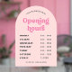 Modèle de décalque de fenêtre d'heures d'ouverture d'entreprise rose rétro avec arche rose poudré et police de style nostalgie. Ce panneau d'heures d'ouverture éditable comprend un espace pour le nom de votre entreprise, les heures de travail et les coordonnées. Montrez vos jours et heures d'ouverture sur la vitrine de votre magasin avec ce panneau vinyle d'heures d'ouverture groovy - peut être utilisé pour votre café, restaurant, salon ou toute autre entreprise.