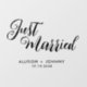 La bannière moderne de réception de mariage juste marié est une bannière de fête de mariage en noir et blanc pour votre mariage. Cette élégante conception "Just Married" fait un ajout amusant à la voiture de escapade du couple. Un matériel de mariage parfait pour la décoration mariage. Customisez avec le nom de la mariée et du marié et la date du mariage de la fête de mariage.