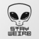 Illustration de la tête de l'alien de dessin avec de grands yeux foncés avec des lettres "Stay Weird". Mots clés : alien, espace, martien, dessin animé, humour, vecteur, science-fiction, séjour, bizarre, espace