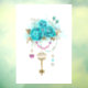 Clé d'or antique aux roses turquoise tendance décorée de feuilles d'or blanc et de perles rose et bleu. Couleur tendance. Rose turquoise. Blanc doré. Tiffany bleu.