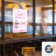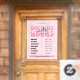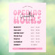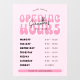 Heures d'ouverture d'une fenêtre rose rétro accrochant la modèle de la décalcomanie dans un jeu de couleurs rose féminin, avec polices rétro et disposition moderne. Ce panneau d'heures d'ouverture modifiable comprend de l'espace pour le nom de votre société, les heures d'ouverture et les coordonnées de votre contact. Montrez vos jours et heures d'ouverture sur votre vitrine avec ce panneau vinyle de vitrine moderne - peut être utilisé pour votre salon de beauté, spa, boutique, boulangerie, bureau ou boutique.