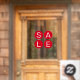 Porte-fenêtre de vente avec les lettres S, A, L et E sur les cercles rouges. Mettez votre fenêtre de magasin pour annoncer les ventes actuelles.