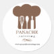 Un graphique d'un casquette de chef brun avec des outils de cuisine créant un espace négatif à l'intérieur domine cet autocollant promotionnel. Assez polyvalent pour travailler pour une entreprise de restauration, un chef ou un boulanger personnel. Disponible en couleurs alternatives avec des produits correspondants.