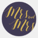 Un autocollant de mariage rustique chic, présente le "Mrs et Mrs" avec des écritures en couleur or sur l'arrière - plan bleu cobalt.
