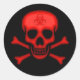Autocollant noir avec crâne et os croisés à risque biologique rouge.