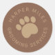 Autocollant rustique avec un empreinte de patte de chien brun sur une image de papier brun, et avec votre texte personnalisé autour. Veuillez noter que la modification du texte peut affecter le rayon, aller à la personnaliser plus loin et apporter les modifications nécessaires. Convient aux petites entreprises, toiletteur, vétérinaire, randonneur à chiens, garderie pour chiens.