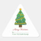 Autocollant de Noël en forme de triangle avec un Sapin de Noël et ses guirlandes, ses boules et son étoile en haut. Personnalisez-le et ajoutez-le à vos cadeaux pour votre famille ou vos amis !