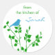 Baguettes de conserves mignonnes et tendance avec un oiseau bleu moderne assis sur une branche d'arbre vert avec les mots From the Kitchen of. Étiquettes de cuisine personnalisés pour les produits cuits et en conserve.