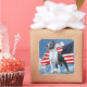 Un fier taureau bleu et blanc (American Staffordshire Terrier) debout devant un drapeau américain agitant et un ciel bleu.