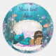 Des autocollants de baby shower de sirène avec d'adorables sirènes ethniques portant une tiare et des perles sur un bleu turquoise et violet sous l'arrière - plan de la mer. Vous pouvez ajouter du texte pour personnaliser ces mignons autocollants de baby shower de sirène afro-américain.