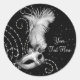 Autocollants de fête masquée noir et blanc avec masque à plumes élégant. Ajoutez votre propre texte en choisissant simplement le bouton "Personnalisez-le !".