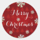 De jolis autocollants rouges Joyeux Noël avec des flocons de neige et des sapins de Noël en arrière-plan.