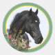 Autocollants de cheval noir. Les fleurs sauvages poussent près de la tête d'un beau cheval noir. Il a un tout petit peu de blanc sur le visage, mais tout le reste est noir. L'autocollant est bleu pâle avec une bordure verte ainsi qu'une fine ligne de jaune doré. Les autocollants ronds existent en deux tailles.