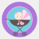 Autocollants Ronds Classiques d'Anniversaire de Poupée Bébé Fille en Violet, Rose et Bleu Sarcelle.