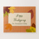 Célébrez Thanksgiving, Friendsgiving, ou toute autre occasion d'automne avec ce puzzle d'automne amusant et rustique. Doté d'un motif orange vintage qui rappelle une couverture de pique-nique, ce puzzle est parfait pour tous les amateurs de feuillage d'automne. Chaque feuille est dessinée à la main pour une touche parfaite. Un grand cadeau pour la famille et les enfants de se souvenir des moments heureux ensemble. Texte entièrement personnalisable pour votre événement, quel qu'il soit.