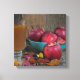 red apples in turquoise bowl with apple cider drink in mug and autumn leaves on rustic wood