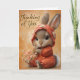 This beautifully tender “Thinking of You” card features a baby bunny dressed in an orange autumn romper and bonnet, holding a bouquet of soft peach blossoms. With her shy, heartwarming expression and warm amber backdrop, this card is perfect for offering comfort, support, or a sweet reminder that someone is in your thoughts. A gentle, soulful design ideal for any caring occasion.