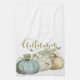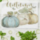 Beautiful watercolor pumpkins in shades of soft blue, green, gold and brown on a white background are featured on this pretty kitchen towel. The word "Autumn" is written out across the top of the gathered pumpkins. Coordinates with the other designs in the Autumn Blue Pumpkin Collection from Vintage Mama's Cottage Shop.