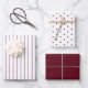 This set of wrapping paper sheets features a solid autumn burgundy coloured sheet with coordinating sheets of autumn burgundy pinstripes on white, and autumn burgundy polka dots on white.