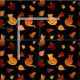 A pattern of silhouette ginger cats and Autumn leaves in burnt orange, yellow and red, on a black background. A great design for a cat mom who loves to sew.