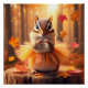 A chipmunk wears an orange tutu standing on a tree stump in an autumn forest while forming a heart shape with its paws