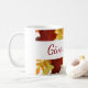 Ceramic coffee mug shown with a pretty fall leaves print.