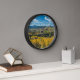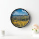 The size of the clock is dramatic and the abstract alcohol ink design is soothing and intricate at the same time. I chose the black frame that adds pop to the blue and gold design. The gold printing would be better in a slightly darker or larger font. I love it and I’m looking for just the right place in ny new apartment. I would recommend this clock for a personal gift or a present. I feel that the quality is excellent for the money! I’m a bit of a clock nut so I’m pretty particular about my purchases. The clock is larger in diameter than many if the clocks I have, so it stands out very well. I think a slightly darker printing color and a moderately larger size would best suit a professional decor or add more impact in a work place item.