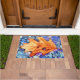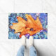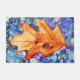 A pretty watercolor of a brown autumn leaf against a blue water background.