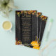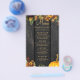 Fall floral botanicals and rusty orange pumpkin over a dark barn wood with string lights birthday party menu paper flyer (advertising type of paper) template.