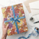 A collage pattern of tree leaves in hues of purple, red, orange, yellow, brown and green. Use gift wrap for a variety of occasions - a wedding, bridal shower, thanksgiving and outdoor nature theme events.