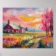 A vibrant modern abstract landscape painting of a farmhouse in autumn, featuring warm hues of orange, pink, and gold with expressive abstract brushstrokes. The dynamic composition captures the beauty of fall, evoking the serenity of a countryside scene. The bold colours and fluid brushwork create a sense of movement and energy, giving this piece a contemporary twist on a classic rural landscape.