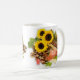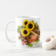 Sunflowers, Indian Corn plus nuts and autumn leaves in fall colours surround a candle in this holiday arrangement. Great for Thanksgiving or just that autumn feeling.