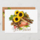 Sunflowers, Indian Corn plus nuts and autumn leaves in fall colours surround a candle in this holiday arrangement. Good for invites to any late year function or party.