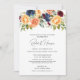 This stunning rehearsal dinner invitation features a lush watercolor floral arrangement of golden yellow roses, peach blooms, navy peonies, and deep burgundy flowers cascading across the top. Clean modern typography pairs beautifully with the rich, jewel-toned bouquet on a crisp white background, with a coordinating navy blue backing. All wording is fully customizable to suit your event details. A perfect choice for a fall or autumn wedding rehearsal dinner.